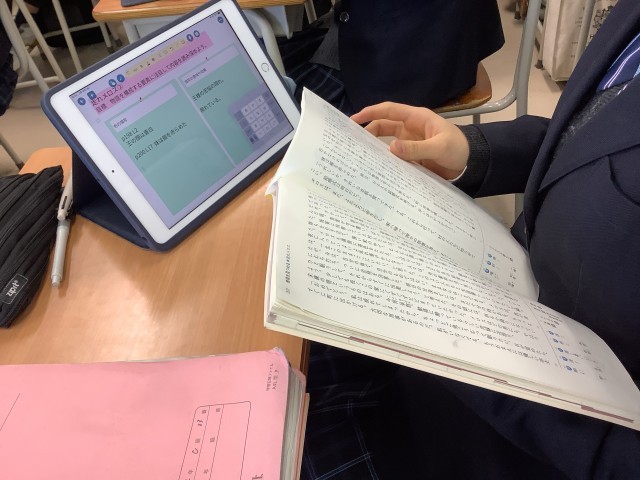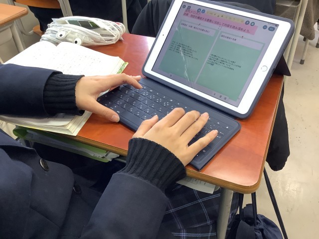 2年国語では、「走れメロス」の読解にiPadを利用しています。風景描写・色の描写・表現技法の3つの表現に注目して、それぞれの気づきをテキストに入力しました。各自のテキストを共有しながら交流し、読みを深めています。