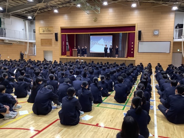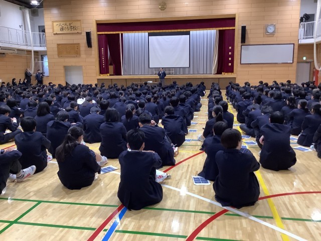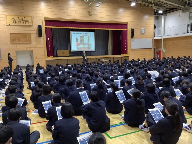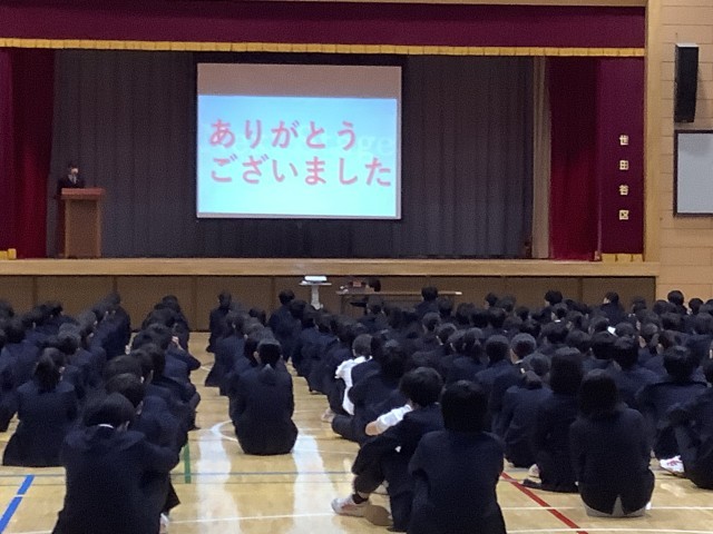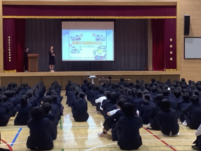 また、生徒会役員から「生活の決まり」の改善に関するアンケート結果が発表されました。今後、「校則状況確認WEEK」を行い、現状理解した上で、どのように改善していけばいいか話し合っていきます。