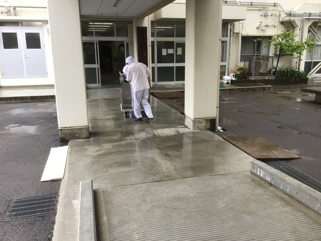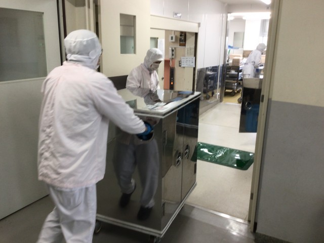 砧南中の給食室は教室がある棟と反対側の棟にあり、給食を運ぶためには外の渡り廊下を通らなければならないため、配缶した後の食缶類をコンテナに積んで運び、リフトのある配膳室でワゴンに食缶を移しかえます。渡り廊下は傾斜があり、今日のような雨の日は床が濡れているため運ぶのにも一苦労です。