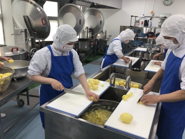 新じゃがいものそぼろ煮のじゃがいもの使用量は、全校分で60kgになります。1個1個芽とりをして洗ったあと、食べやすい大きさに切っていきます。煮物はみんなよく食べてくれていました。