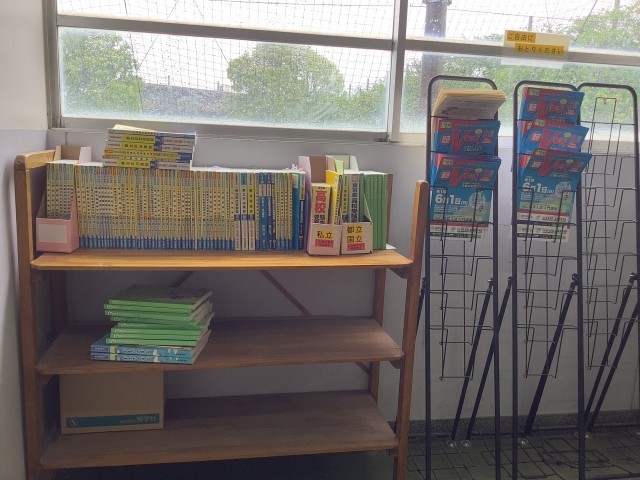 3年D組の前に進路に関わるお知らせや、高校の過去問題集があります。チラシは自由に持ち帰ることができます。問題集を借りたい人は先生に申し出てから借りましょう。
