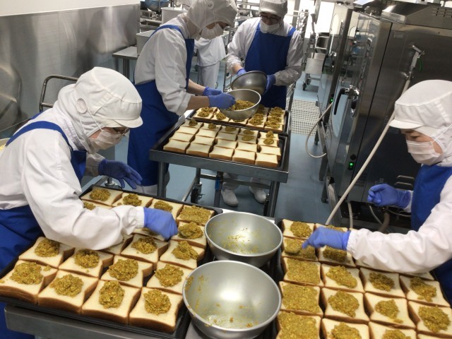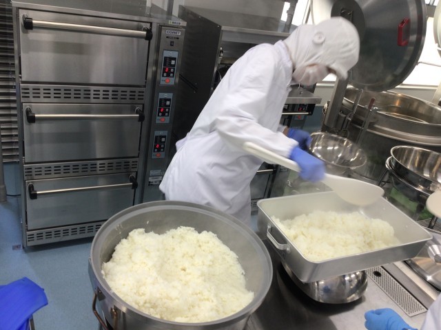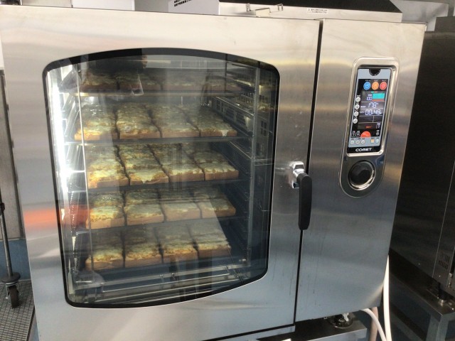 肉や魚を焼いたりトーストを作るときは、スチームコンベクションオーブンを使って焼きます。このオーブン1台でトーストを100枚焼くことができます。今日のドライカレートーストはスチームも使って焼き上げたので、冷めてもしっとりふわふわでとても好評でした。
