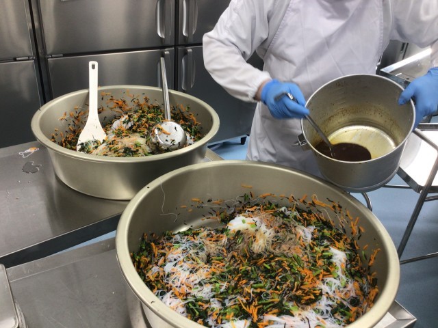 給食の汁物のだしは、毎回朝から削り節や鶏ガラからとっています。サラダなどの和え物のドレッシングも、調味料から全て手作りしています。給食では既製品はできるだけ使わず、材料から手作りしたものを提供しています。