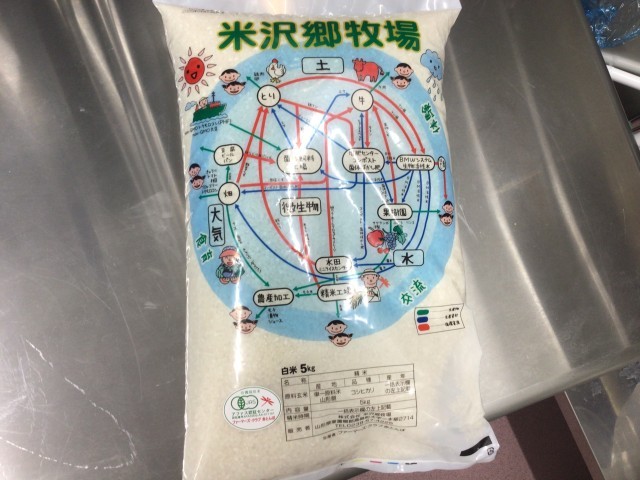 今日のごはんは、有機米のコシヒカリを使っています。学校給食では、化学肥料や農薬を使わずに、環境にやさしい方法で育てたお米を毎月1回使用しています。