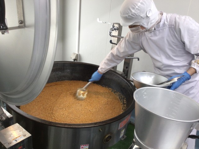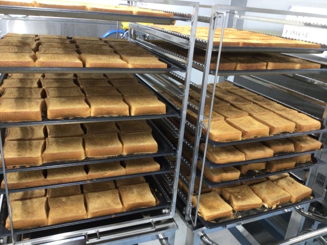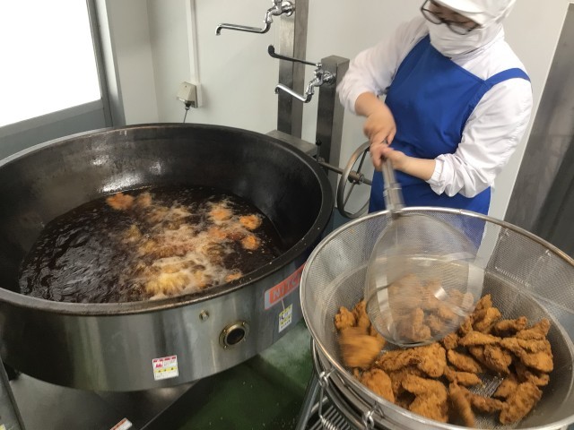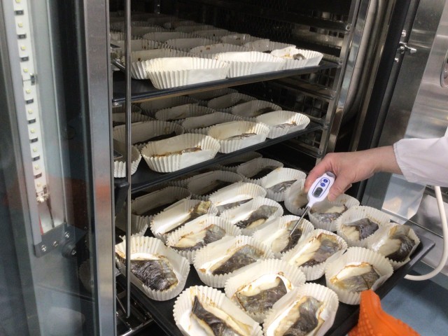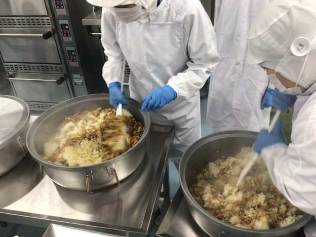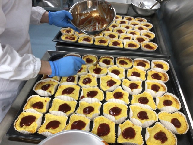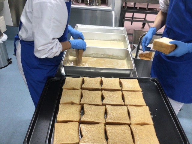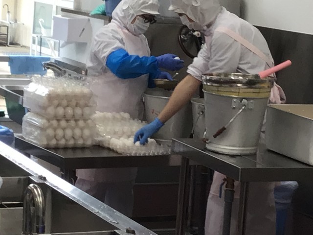 給食のオムレツは、1個1個フライパンで作る訳にはいかないので、カップに卵液を流し、オーブンで焼いて作ります。卵は殻が入らないように1個1個確認しながら割っています。オムレツは全部で570個の卵を使いました。