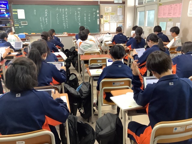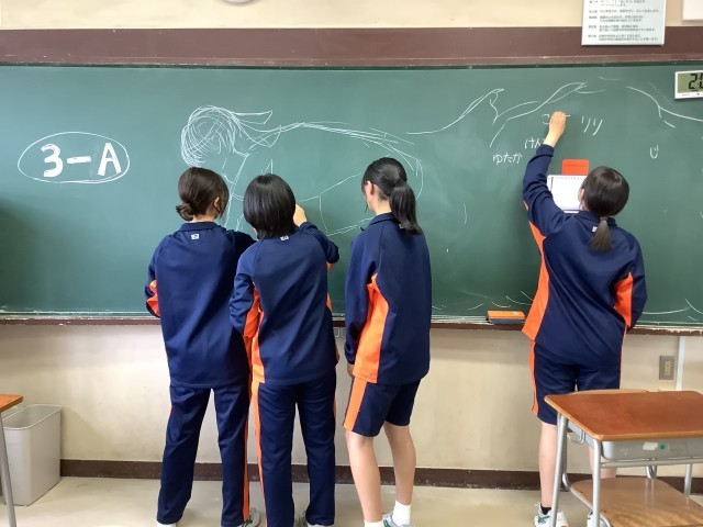 天候がよくありませんが、明日の体育祭に向けて係会を行いました。係生徒達は明日の仕事の確認を行いました。クラスの意気込みを模造紙に書いたり、黒板アートで表現したりもしています。