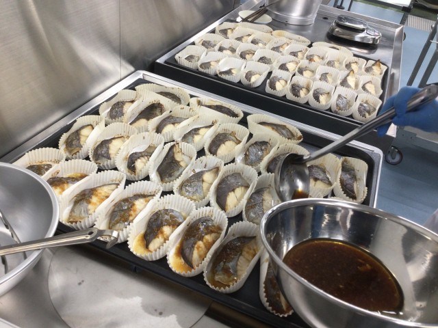 今日の魚はミナミカゴカマスという魚で、通称銀サワラとも呼ばれています。オーブンで焼いた後に調味料とたまねぎを合わせたタレをかけました。一味唐辛子がピリッとしたアクセントになっていておいしかったです。