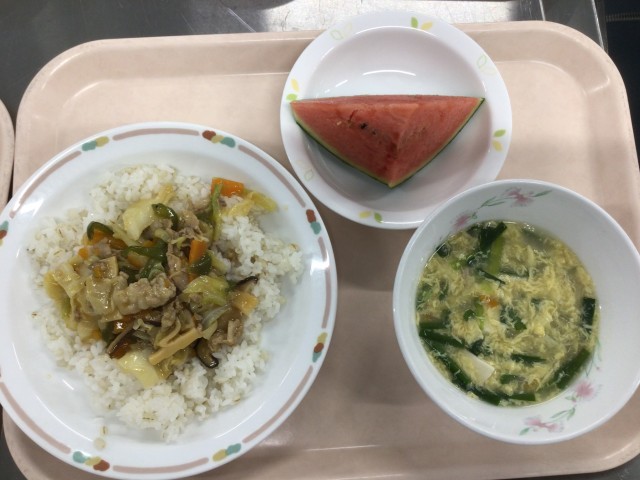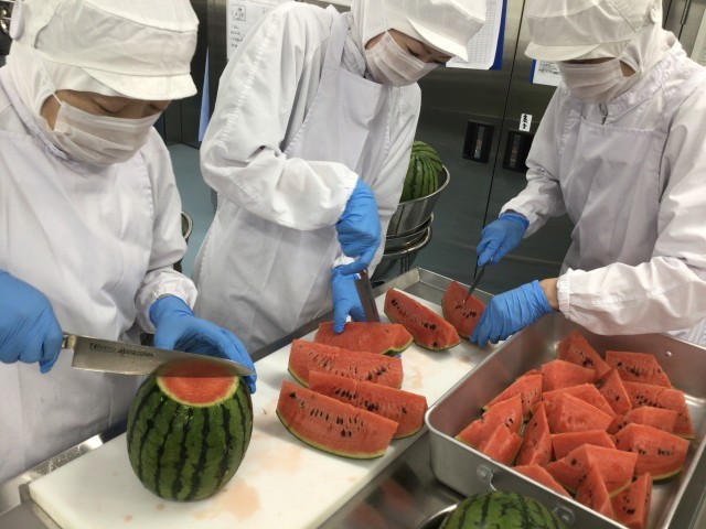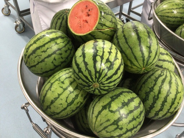 今日のすいかは、茨城県産の小玉すいかです。すいかは中心部においしさが集まっているので、切り分けるときはくし形切りにすると、おいしいところがみんなにいきわたります。