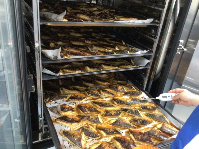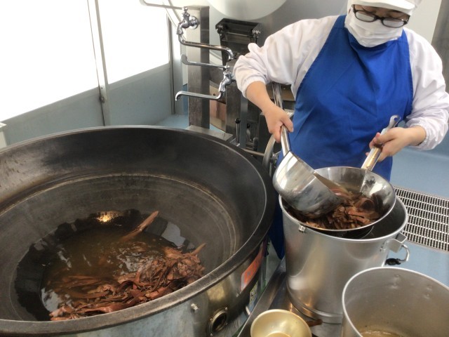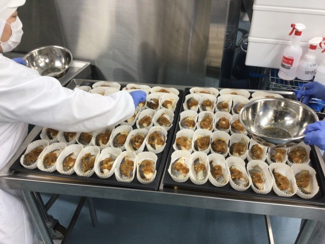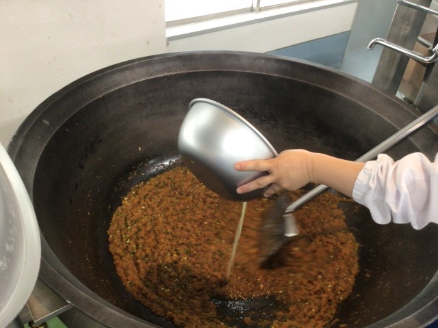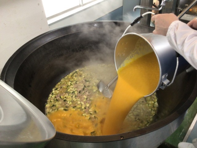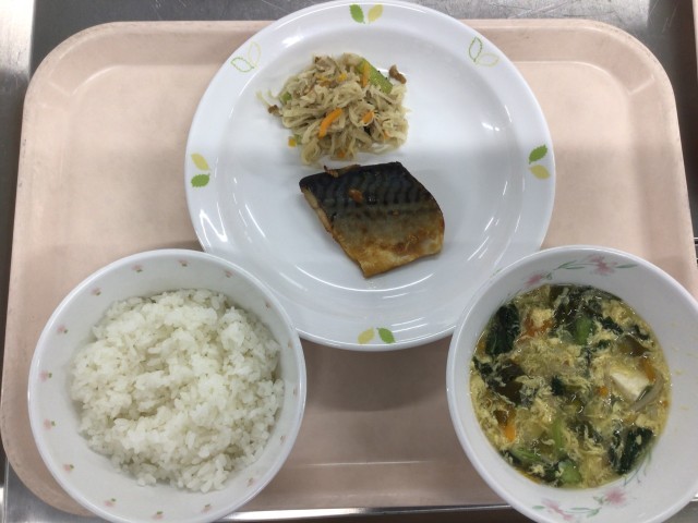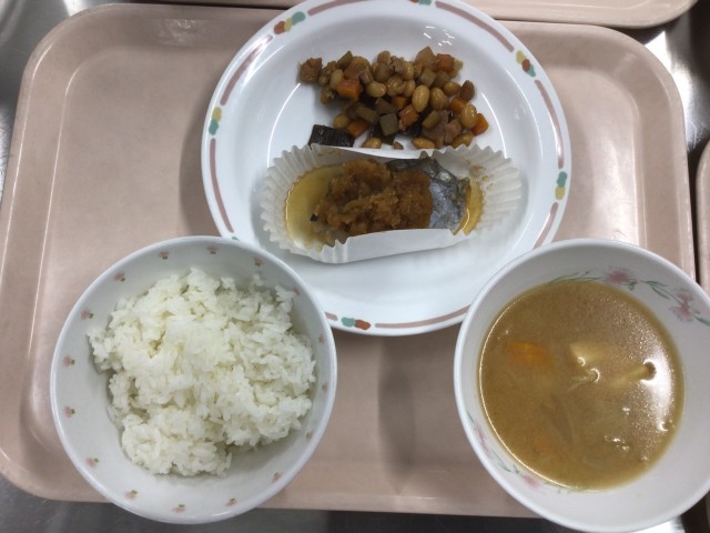 今日は和食の献立です。さばのねぎみそ焼きは、みそと調味料・ねぎ・しょうがを合わせたみそダレにさばを漬け込み、オーブンで焼いて作りました。汁物のだしは、かつおの厚削り節を使ってとっています。調理員さんが丁寧にだしをとってくれておいしい汁物ができました。