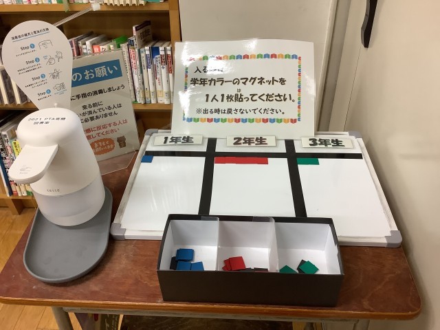 日頃よりご利用ありがとうございます。今年度から、来館者確認のマグネットを入り口に設置しています。ご協力お願いします。新刊・季節や行事にちなんだおすすめ本コーナーも用意しています。