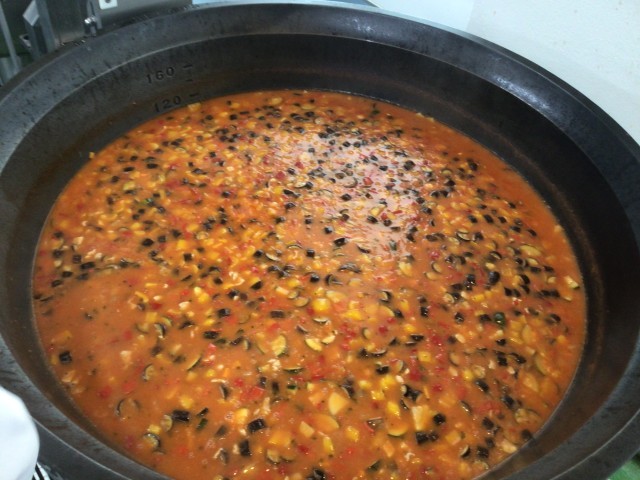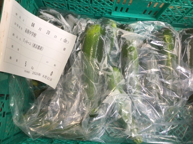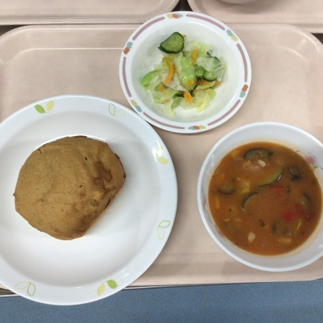 夏野菜とひよこ豆のトマト煮には、ビタミンたっぷりの夏野菜、なす、赤ピーマン、黄ピーマン、ズッキーニなどがたっぷり入っています。ズッキーニは見た目はきゅうりのようですが、かぼちゃに近い品種です。今日のズッキーニは、東京産の地場野菜です。