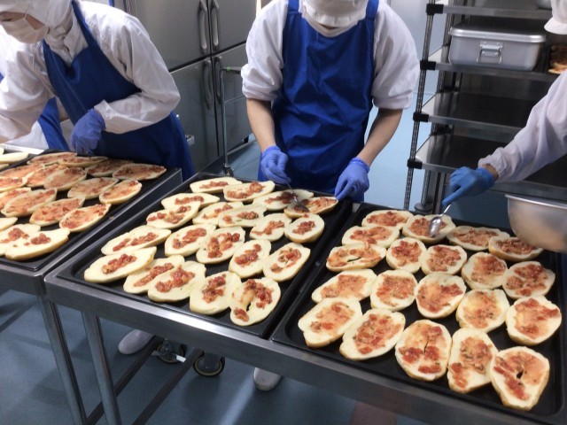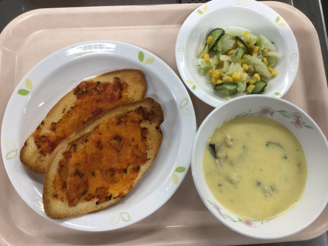 ブルスケッタはイタリアの軽食の一つで、おつまみや前菜として用いられるイタリア中部の郷土料理です。薄くスライスしたパンをカリッとトーストして、色々な具をのせて食べます。給食では、ソフトフランスパンにオリーブオイル・にんにく・トマト・ツナを混ぜた具をのせてオーブンで焼いて作りました。