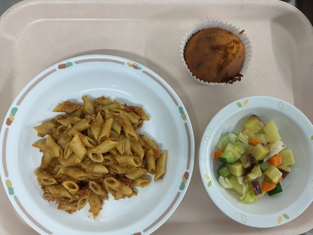 4月13日の給食献立・ペンネのミートソース・いもいもサラダ・キャロットケーキ・牛乳今日のデザートはキャロットケーキです。柔らかくゆでたにんじんをオレンジジュースと一緒にミキサーにかけ、卵やバター、砂糖...
