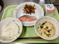 【 メ ニ ュ ー 】・ご飯・鮭の塩焼き・じゃが芋の金平炒め・かき玉汁【 産 地 】米:山形(庄内産つや姫) 鮭:チリ産 ごぼう:青森 豚肩ロース(金平)・鶏もも肉(汁)・じゃが芋:北海道 人...