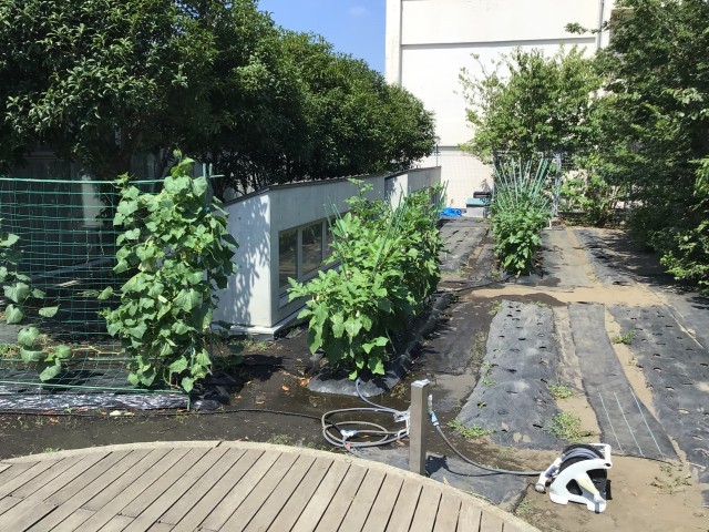 連日の猛暑、一日中、よく日の当たる屋上農園もすぐに水が乾いてしまいます。