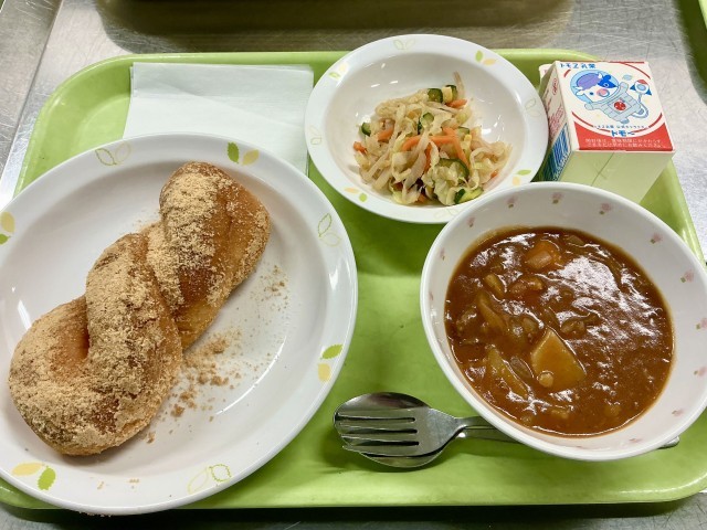 2学期、2回目の給食です。今日は大人気の「きな粉揚げパン」と、ぜいたくに牛肉を使った「ビーフシチュー」です。夏休み明けの最初の週の給食は、みんなが楽しみに学校に登校できるよう、人気メニューを中心に組んでいます。ただ、昨日のカレーライスメニューの残菜が予想を遥かに超える多さだったので、ちょっと不安な気持ちは残ります。ですが、今日も全力で作りました!