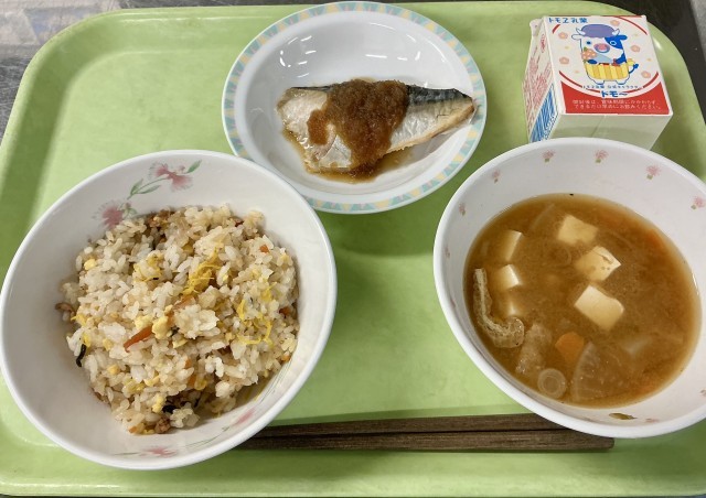 魚の栄養と豚汁の野菜・豆腐・みそなどの栄養によってバランスもバッチリ!そして、今日は手紙も付けました!菊の花を食べて、いつまでも健康で長生きに!そしてこれからも給食を食べて、毎日健康に過ごしてください!