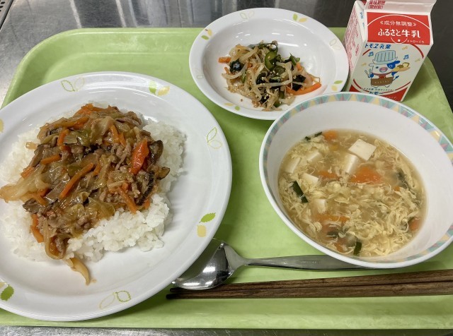 今日の給食は、キャベツたっぷりのホイコーロー丼です!大量調理では、食材の「かさ」が増えるので釜からはみ出やすい、食材から水分が多く出るので味がぼやけやすい、といった影響を受けます。そこで砧中では、キャベツは切った後に熱湯をかけることで、適度にしんなりさせるようにしています。その上で、ジューシーな豚肩ロースと一緒に炒めていき、赤みそ・砂糖・しょうゆなどでしっかり味付けしてあげれば、白ご飯にぴったりの美味しい「ホイコーロー丼」が完成します!具には水溶き片栗粉で適度にとろみもつけているので、教室でも配膳しやすく、ご飯と一緒に食べやすいはずです。