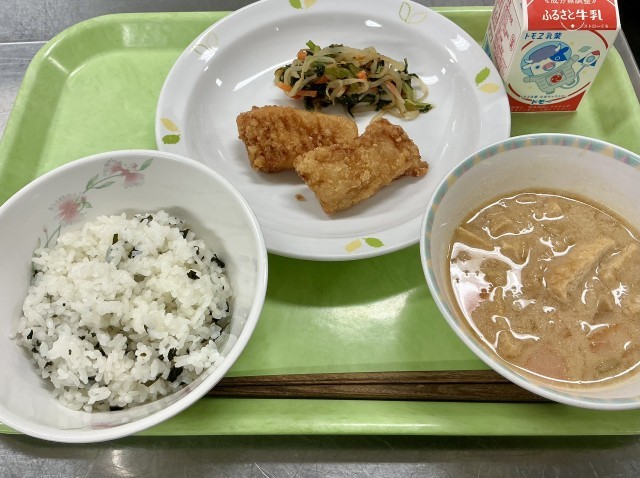 今日は昔からの給食の定番の「わかめご飯」と、新メニューの「いかのかりんと揚げ」です。
