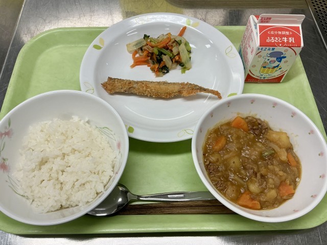 おかずにはザクザクの食感が気持ちいい「ししゃもフライ」と、砂糖・しょうゆの味をたっぷり吸い込んだ「お揚げ」が美味しい「白菜のおひたし」です!肉じゃがにボリュームがあるので、ししゃもは1匹でも満足感は薄れないはずです!よく食べるクラスには、何本かおまけも入れています!骨ごと食べられる小魚は、成長期のカルシウム源となる貴重な食べ物です!しっかりよく噛んで食べましょう!