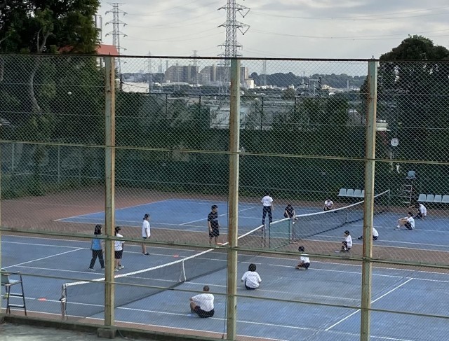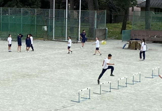 I組や2年生が、校庭でサッカーやハードル、テニスなどの授業をしているようです。