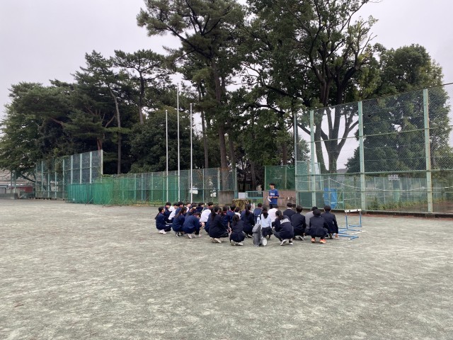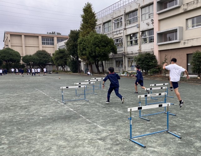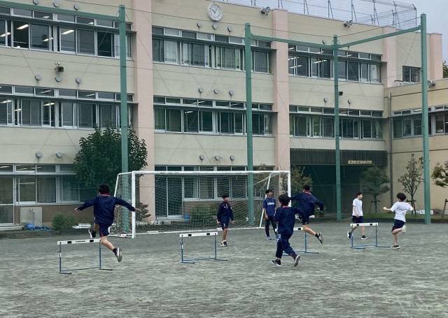 わずかに雨が降っておりますが、校庭ではハードルの授業が行われています。