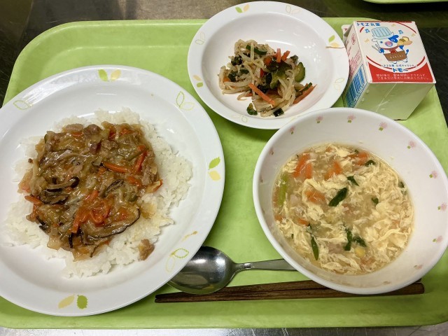 そんなみなさんを栄養面からサポートするため、今日の給食は野菜たっぷりのホイコーロー丼を作りました!豚肉のジューシーさと、それを引き立たせる「赤みそ」メインの味付けがとても美味しい!思わず、ご飯と一緒に思いっきり食べたい衝動にかられます。ピーマンのほんのりとした苦味も、アクセントになっています!ピーマンが苦手な人でも、小さく切ってあり量も少ないため、安心して食べられます。ピーマンはあっという間に火が通るので、入れるのは本当に最後!こういったたくさんの小さな工夫が調理員さんの技術であり、それによって美味しい給食は作られています。
