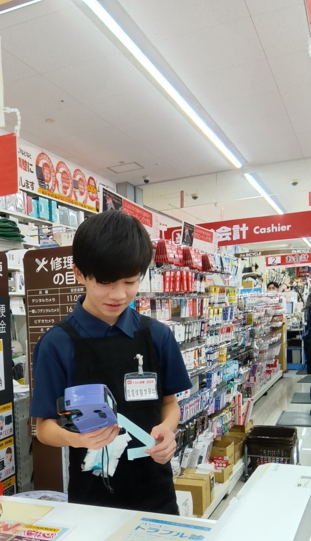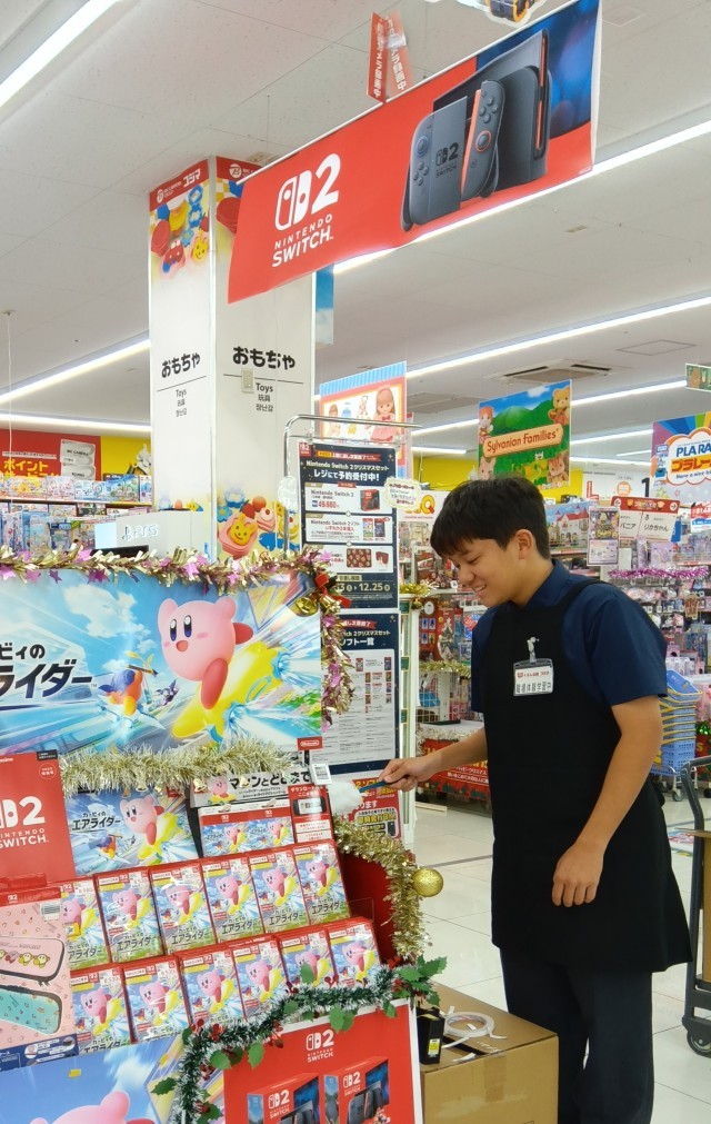 微調整をしながら、ゲームカセットの棚をクリスマス仕様に飾り付けしていました。値札シールを作成する体験もさせていただきました。