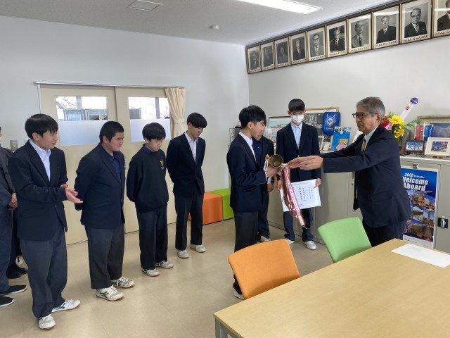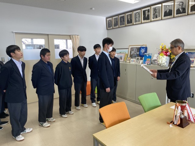 世田谷区の大会で優勝した卓球部の激励会が校長室で行われました。