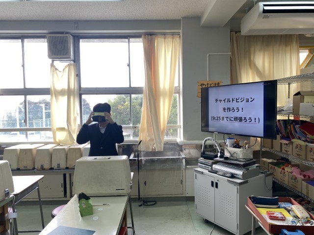 「チャイルドヴィジョン」を作り、装着してみることで、幼児の視界の範囲を体験しています👓