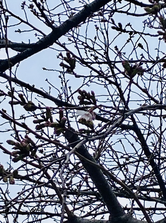 校門の桜🌸、一輪だけ開いているのを見つけました!