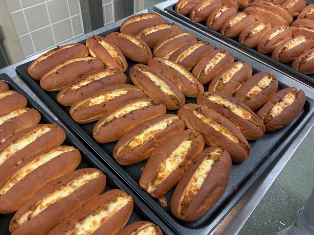 今日の主食は、カレーミートドッグです。切り込みを入れたコッペパンに、手作りのカレーミートソースを挟み、たっぷりチーズを上からかけて焼きました。