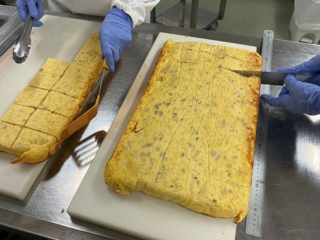焼いたり、蒸したりできるスチームコンベクションオーブン(スチコン)は、春休みに2台新しくなりました。新しいスチコンで卵焼き類を焼くのが初めてでしたのでキレイにできるかドキドキでしたが、前のスチコンの時よりもオムレツの厚みが出て美味しくふっくらした仕上がりになりました。
