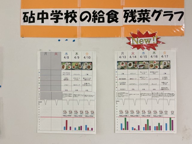 そして、遅くなりましたが、今年度も前年度に引き続き、残菜率の掲示を行っていきたいと思います。「残菜をできるだけ少なくする」という意識を子ども達にも持ってもらえるよう、給食室一同おいしい給食の提供を心がけていきたいです。
