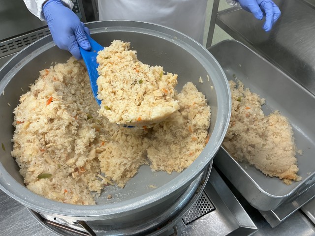 今日の主食は、たけのこご飯です。たけのこは日常的に給食で使用する野菜ではありますが、今日のたけのこは、旬とされる今の時期に収穫された新物の水煮を使用しています。たけのこは、調味料・米と一緒に炊きあげ、別で煮た具材と混ぜ合わせました。