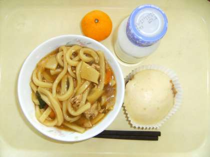 12月6日 カレーうどん 牛乳 肉入り蒸しパン みかん