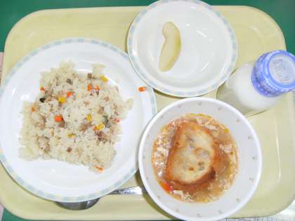 12月10日 きのこピラフ 牛乳 アクアコッタ ラフランス