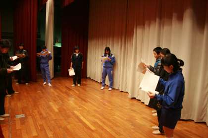 来週19日(土)に第7回目となる14歳の成人式が世田谷区民会館で行われます。区内中学2年生が集まって「生徒会サミット」を結成し、生徒会活動について話し合いを行い、後輩である1年生に向けてメッセージを発信する場がこの14歳の成人式です。砧中からも2名の役員が参加している第2ブロックの中学校(砧、砧南、桜木、桜丘、喜多見、船橋希望の6校)の生徒会メンバーが昨年から土曜日を中心に本校に集まり、出し物の練習をしてきました。今日が本番前最後の練習となり、体育館舞台を使ってリハーサルを行いました。当日19日は午後1時45分から始まります。乞ご期待を!