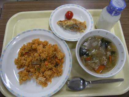 1月15日 ジャンバラヤ 牛乳 白菜スープ 魚のガーリック焼き ミニトマト