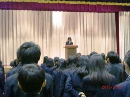 砧中学校では月に1回生徒会が主催する生徒会朝礼があります。今日の生徒会朝礼は、会長挨拶のあと、14歳の成人式に参加した1年生徒会役員の感想、そしてベルマーク運動への協力のお願いをしました。そして5校時終了前に避難訓練を実施。ここ数カ月の天候不良で校庭が使用できずにいたので、今日は久しぶりの校庭避難ができました。全校650名近くの生徒が素早く校庭に集合するのは大変なことですが、今日は6分20秒で避難が完了しました。次回3月の訓練では、さらに短時間で整然と行動ができることを期待しています。