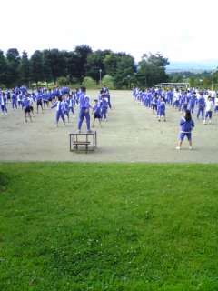 朝会のラジオ体操の様子です。食事係は配膳と水筒のお茶入れを行っています。