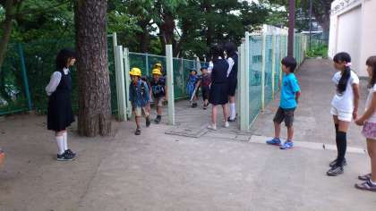 今日は、砧の学び舎の交流として砧小学校に出向きあいさつ運動を行いました。