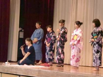 今回は、事前に着付けした生徒が舞台に並び、涼しげな浴衣姿を披露しました。