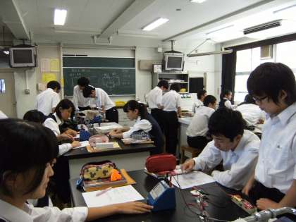 理科室では「電気の実験」を行いました。いろいろな回路の電圧をはかり、電圧の性質をレポートにまとめました。写真左は、回路図をみながら班で協力して回路を組んでいる様子です。