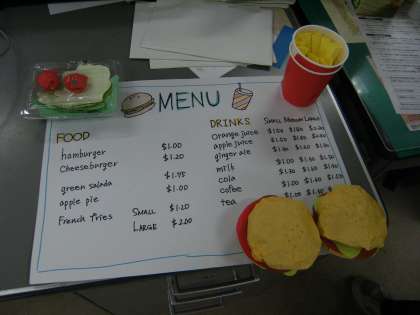 一方視聴覚室では、英語のスキットを行いました。ハンバーガーショップでの一コマを、2人一組で英語の台詞をしっかり練習合い、さらには小道具まで自作し、披露し合いました。右の写真は小道具の力作です。