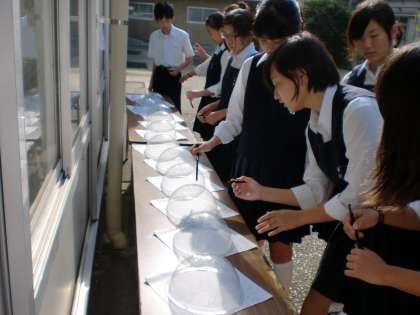 写真は、透明半球に太陽の位置を示す印をつけているところです。