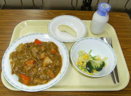12月9日 大根カレーライス 牛乳 ブロッコリーとコーンのサラダ ラフランス