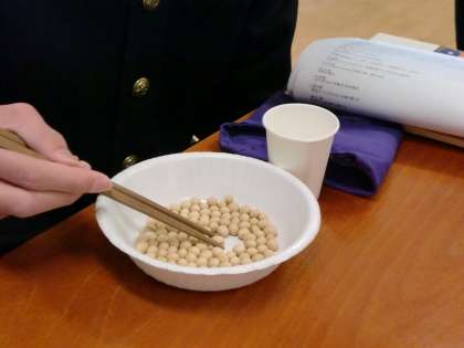 魚醤のにおいや味を確かめたり、2年生の時に作った箸を使って、1分間に大豆や小豆をいくつ箸でつまめるかなどゲーム性をもたせた授業で、生徒達も楽しそうに学習にとりくんでいました。