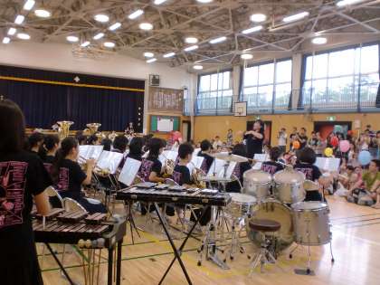 今日は、砧小学校で行われた「砧っ子夏祭り」で演奏しました。演奏した曲は、コンクールでも演奏する「SEDONA」、アナと雪の女王の主題歌「ありのままで」を演奏しました。時折、雨が降る不安定な天気でしたが、演奏中は雨もやみ、あたたかい拍手に包まれて演奏を終えることができました。