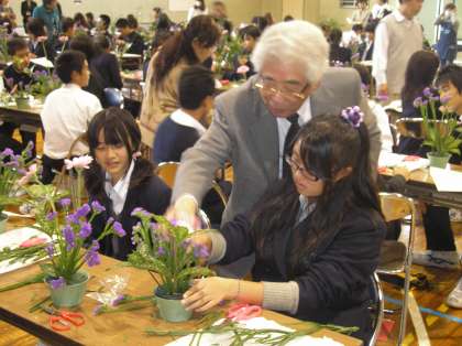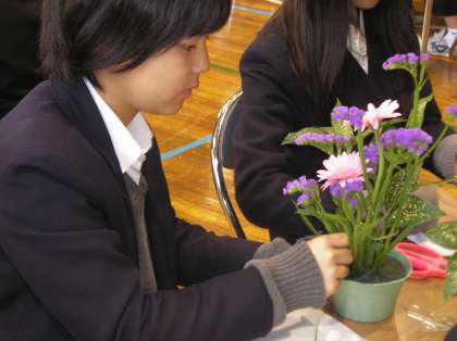 花を生けている生徒の表情は、真剣です。